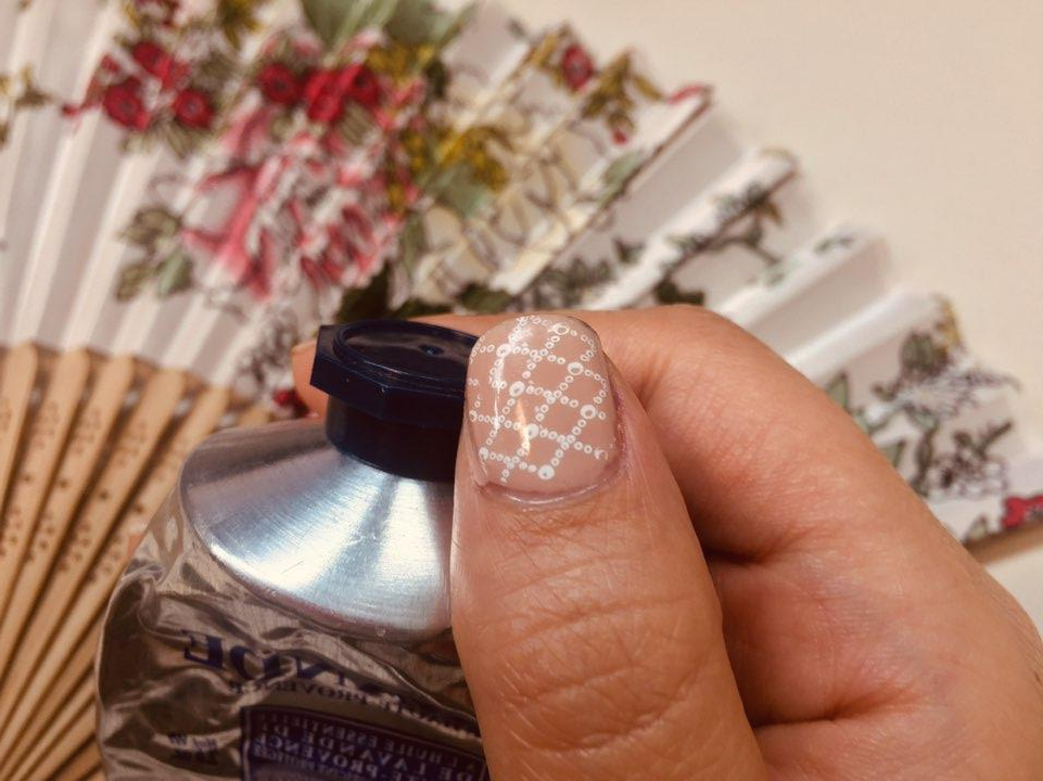 바탕색은 누디한 핑크 젤 폴리쉬는 2콧 바른 후 큐어링 후 잔잔한 레이스 무늬를 그려봤어요.